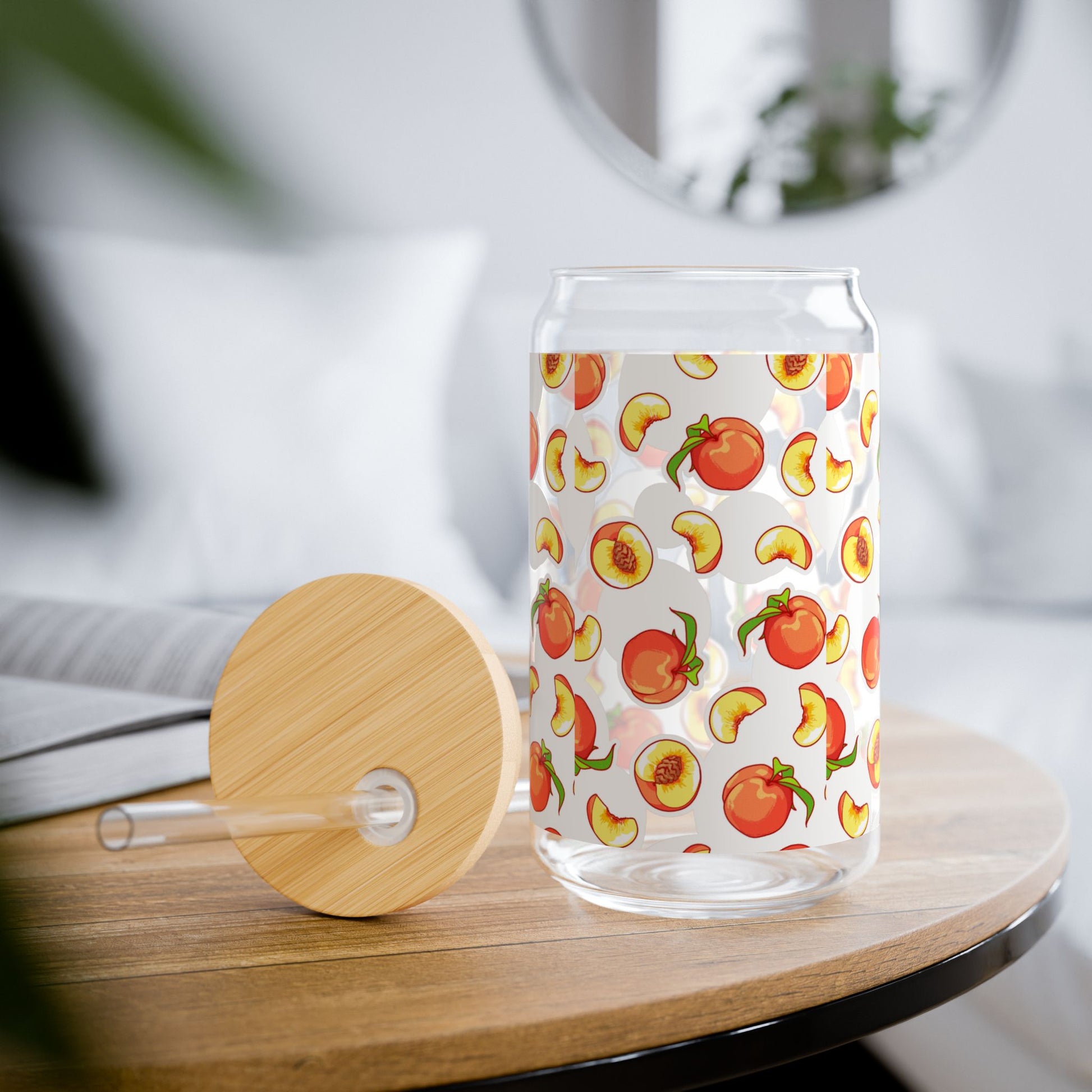 Peach Pattern 16oz Sipper Glass with Bamboo Lid & Straw — Reusable Fruit Drink Tumbler
